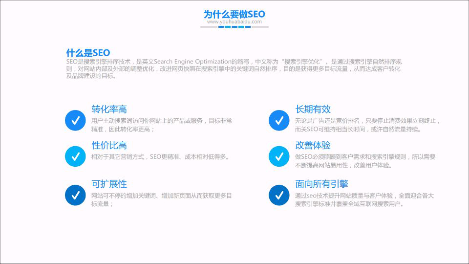先来了解SEO是什么,通过改进网站从搜索引擎获取自然排名的过程称之为SEO。我们要做的是一个优化,站内优化网站结构,站外提升网页快照评价,优化用户搜索过程,优化用户体验,让用户看到的是所需要的。