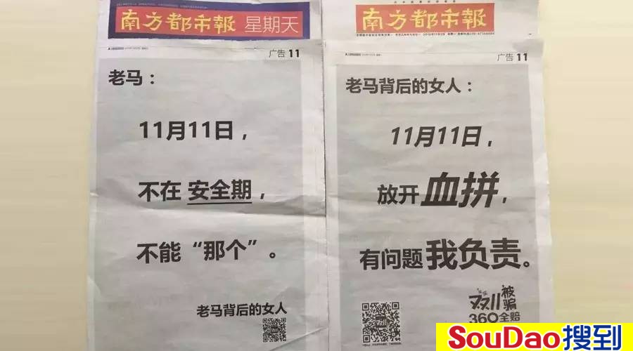 南方都市报第一版:11月11号,不在安全期,不能“那个”——老马背后的女人;第二版:11月11号,放开血拼,有问题我负责,下面备注:360手机卫士。